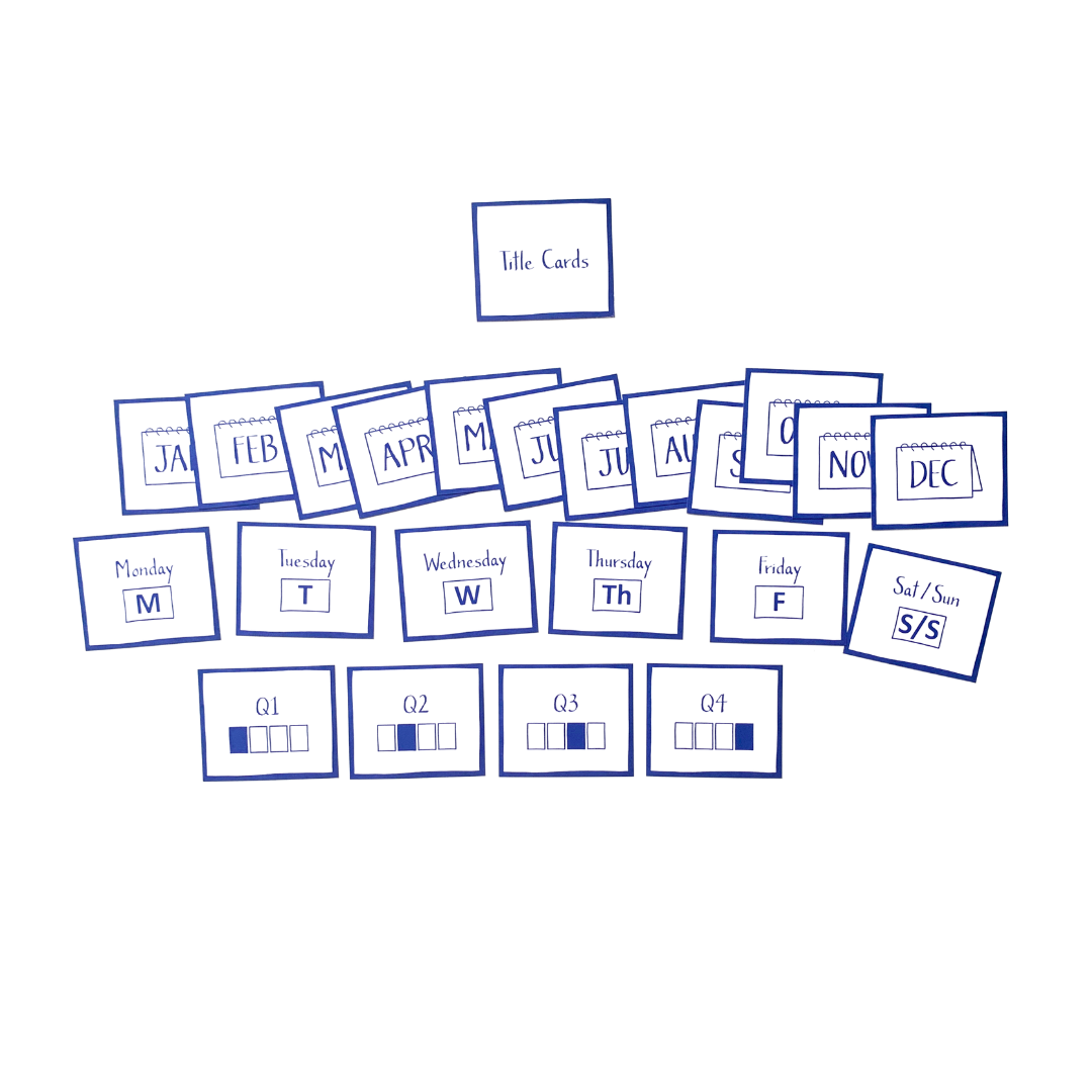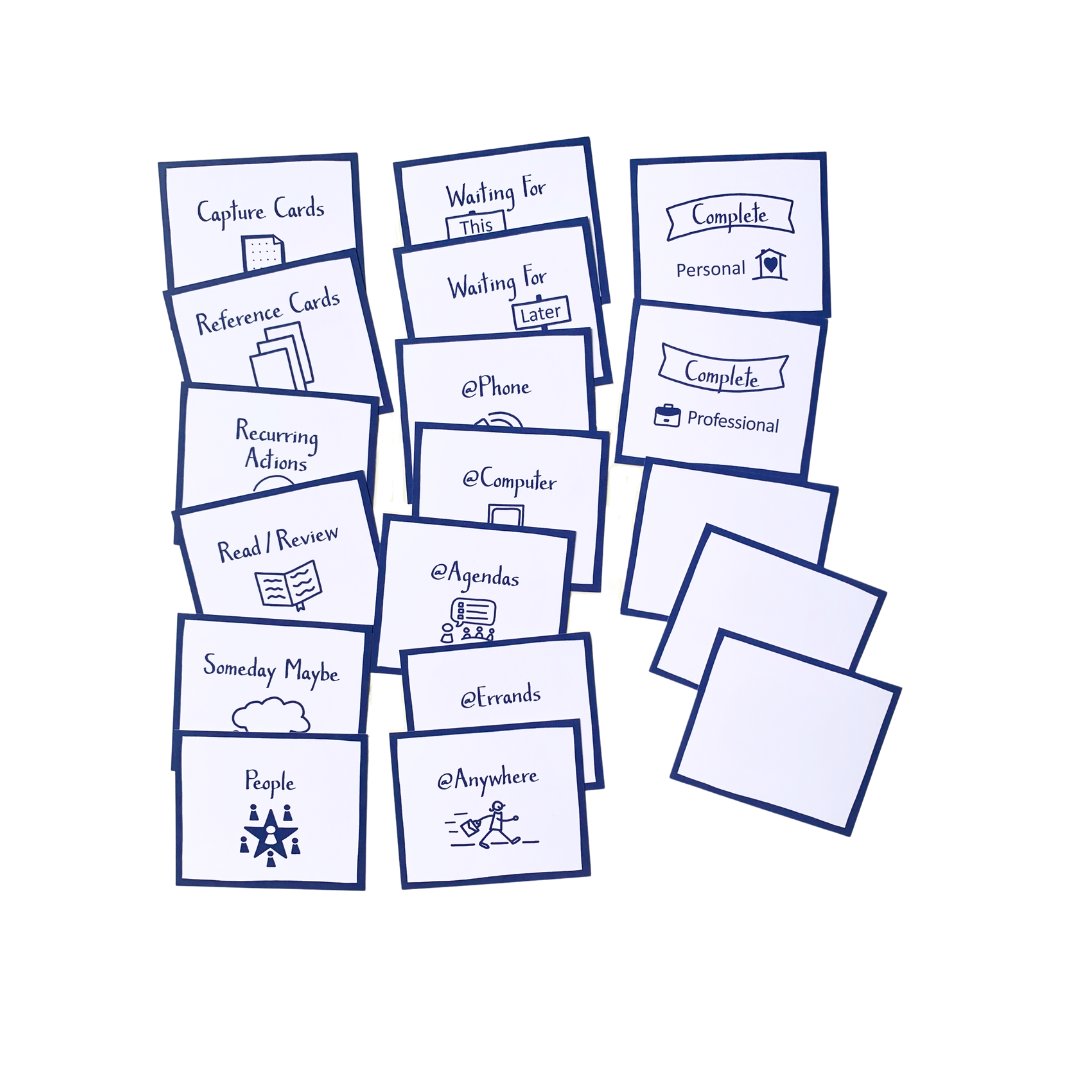 These include: Contexts (phone, computer, errands, agendas, anywhere, read/review) Days, Months, Quarters, Waiting For This Week, Waiting For Later, Someday/Maybe, People, Recurring Actions, Reference Cards, Capture Cards™, Complete Personal, and Complete Professional